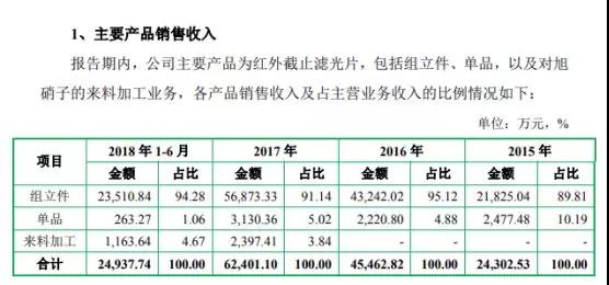 主營業(yè)務(wù)為精密光電薄膜元器件的研發(fā)、生產(chǎn)和銷售,精密光電薄膜元器件包括紅外截止濾光片、生物識別濾光片等。報告期內(nèi),公司的主要產(chǎn)品為紅外截止濾光片,主要應(yīng)用于可拍照攝像頭、電腦內(nèi)置攝像頭、汽車攝像頭和安防攝像頭等數(shù)碼成像領(lǐng)域。