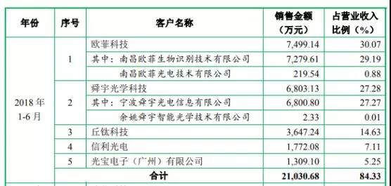 從客戶端來看,宇瞳光學(xué)客戶包括浙江大華科技有限公司、杭州??低暱萍加邢薰尽⒅貞c海岸肯呢個威視科技有限公司、杭州??低暱萍加邢薰尽⒑贾莺?低晹?shù)字技術(shù)股份有限公司、韓華泰科(天津)有限公司、HANWHA TECHWIN CO.,LTD.、YTOT KOREA CO.,LTD.、浙江宇視科技有限公司,今年上半年該公司前五大客戶占當(dāng)期銷售總額為71.23%。