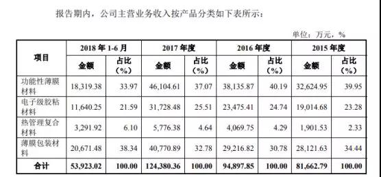 從主營業(yè)務(wù)上看,該公司主營業(yè)務(wù)主要分為功能性薄膜材料、電子級膠粘材料、熱管理符合材料、薄膜包裝材料。據(jù)了解,該公司的銷售收入呈現(xiàn)季節(jié)性波動,下半年銷售收入、凈利潤高于上半年,2018年1—6月為生產(chǎn)淡季,整體產(chǎn)能利用率不高,凈利潤為—462萬元,不過截止目前該公司產(chǎn)品應(yīng)用領(lǐng)域已擴(kuò)展至新能源汽車等其他領(lǐng)域。