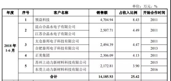 在客戶上,該公司前五大客戶為領(lǐng)益科技、昆山合晶永電子有限公司、江蘇合晶永電子有限公司、太倉泰邦電子科技有限公司、合肥泰邦電子科技有限公司、正美集團(tuán)、蘇州上動力新材料科技有限公司和東莞上動力新材料科技有限公司。而截止目前,該公司產(chǎn)品已與蘋果、華為、三星、松下、中興、OPPO、LG等國內(nèi)外知名企業(yè)建立了長期穩(wěn)定的合作關(guān)系。