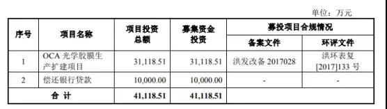 此次,擬在創(chuàng)業(yè)板公開發(fā)行不超過2921萬股,募集資金4.11億元用于OCA光學(xué)膠膜生產(chǎn)擴(kuò)建項目和償還銀行貸款。