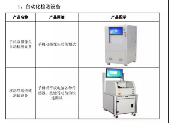 自動化設(shè)備是其營收的主要來源,而筆者獲悉,該公司的自動化檢測設(shè)備主要分為,手機(jī)雙攝像頭自動化檢測設(shè)備、移動終端快速測試設(shè)備、手機(jī)按鍵自動化測試設(shè)備和汽車電動馬達(dá)裝配測試線。