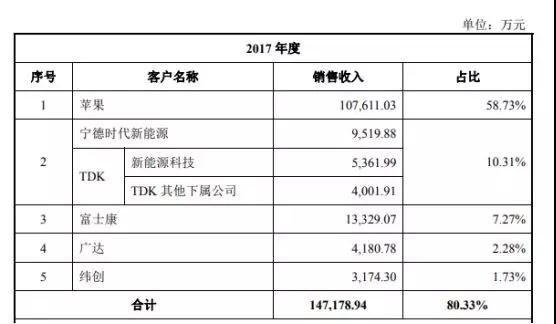 在客戶端,該公司前五大客戶為蘋果、寧德時代新能源、TDK新能源科技及TKD其他下屬公司、富士康、廣達(dá)、緯創(chuàng),而去年這五大客戶的銷售收入占比高達(dá)80.33%,其中,蘋果公司占比最大,達(dá)58.73%。