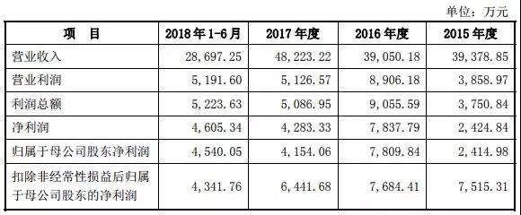 招股書顯示,其2015年度-2018年上半年營收分別為3.93、3.90、4.82、2.86億元,相對應(yīng)的凈利潤則為0.24、0.78、0.41、0.45億元,值得注意的是,2017年營收相比2016年大幅增長,但是凈利潤卻同比大降,不過,從2018年來看,其上半年凈利潤已經(jīng)超過了2017年全年!