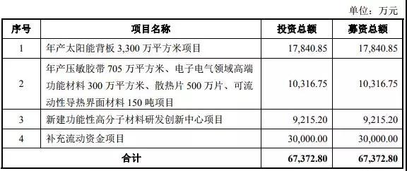 計劃募集資金約6.74億元,其中3億元補充流動資金,占比44.5%;其余將投向年產(chǎn)太陽能背板3300萬平方米項目,年產(chǎn)壓敏膠帶705萬平方米、電子電氣領(lǐng)域高端功能材料300萬平方米、散熱片500萬片、可流動性導(dǎo)熱界面材料150噸項目,以及新建功能性高分子材料研發(fā)創(chuàng)新中心項目。