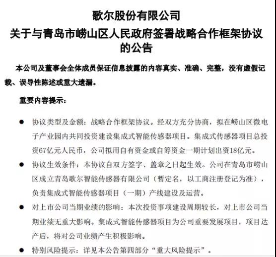 2018年9月11日,其還發(fā)布了最大的投資公告:為加快公司半導(dǎo)體業(yè)務(wù)布局,把握中國微電子產(chǎn)業(yè)發(fā)展的戰(zhàn)略機遇,按照國家《智能傳感器產(chǎn)業(yè)三年行動指南(2017-2019)》、《青島市“十三五”戰(zhàn)略性新興產(chǎn)業(yè)發(fā)展規(guī)劃》的相關(guān)部署,經(jīng)公司第四屆董事會第十六次會議審議通過,擬同撈山區(qū)政府簽署《青島市撈山區(qū)人民政府歌爾股份有限公司戰(zhàn)略合作框架協(xié)議》。