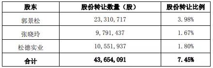 其中,郭景松轉(zhuǎn)讓其持有的智慧松德股份無限售流通股23,310,717股(占公司總股本3.98%),張曉玲轉(zhuǎn)讓其持有的智慧松德股份無限售流通股9,791,437股(占公司總股本1.67%),松德實業(yè)轉(zhuǎn)讓其持有的智慧松德股份無限售流通股10,551,937股(占公司總股本1.80%)。