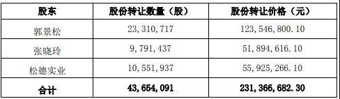 2018年11月,公司控股股東、實控人郭景松及其一致行動人張曉玲、松德實業(yè)、雷萬春及其一致行動人肖代英、舟山向日葵及其一致行動人衛(wèi)偉平,擬合計轉(zhuǎn)讓18.83%股份給佛山公控,轉(zhuǎn)讓價5.3元/股,總價5.85億元,成為公司單一最大股東。