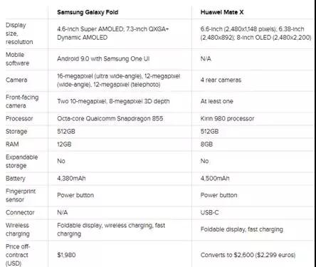 同樣,網(wǎng)上也另外有其它第三方給出的華為Mate X與三星Galaxy Fold的參數(shù)對比圖。