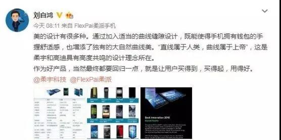 而在去年底搶先發(fā)布可折疊的柔宇,其產(chǎn)品售價為人民幣8999元。柔宇科技創(chuàng)始人劉自鴻就在微博上還發(fā)表了一張柔宇、三星、華為已發(fā)布的三款折疊手機:Mate X、Galaxy Fold與自家的Flex Pai的參數(shù)對比圖。他還在博文上表示,作為好產(chǎn)品,當然最終都要回歸一點,就是讓用戶買得到,買得起,用得好。