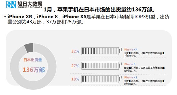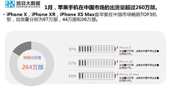 1月,蘋(píng)果手機(jī)在中國(guó)市場(chǎng)的出貨量超過(guò)260萬(wàn)部。iPhone X,iPhone XR,iPhone XS Max是蘋(píng)果在中國(guó)市場(chǎng)暢銷(xiāo)TOP3機(jī)型,出貨量分別為97萬(wàn)部,44萬(wàn)部和36萬(wàn)部。