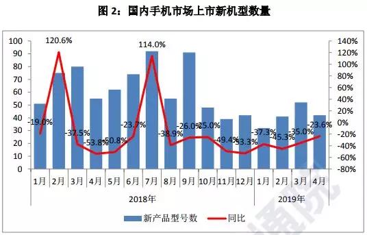 國內(nèi)手機(jī)市場(chǎng)上市新機(jī)型數(shù)量方面,2019年4月,上市新機(jī)型42款,同比下降23.6%,上市新機(jī)型中含2G手機(jī)7款、4G手機(jī)35款;2019年1-4月,上市新機(jī)型167款,同比下降36.0%,上市新機(jī)型中含2G手機(jī)31款、3G手機(jī)1款,4G手機(jī)135款。上市新機(jī)型數(shù)量的下跌,其實(shí)意味著不少品牌新機(jī)數(shù)量的降低,或者逐漸退出手機(jī)市場(chǎng),如此前的錘子和美圖等!