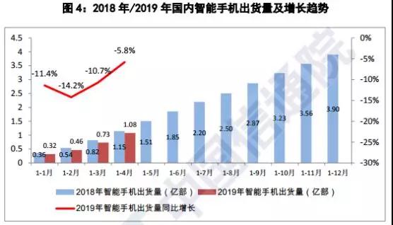 2019年1-4月,國內(nèi)手機(jī)市場(chǎng)總體出貨量1.13億部,同比下降6.7%,其中4G手機(jī)1.08億部,同比下降5.6%,在同期手機(jī)出貨量中占比95.3%,另有2G、3G手機(jī)出貨量分別為524.0萬部、5.7萬部。