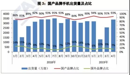 2019年4月,國產(chǎn)品牌手機(jī)出貨量3392.9萬部,同比增長(zhǎng)7.2%,占同期手機(jī)出貨量的92.9%;上市新機(jī)型35款,同比下降32.7%,占同期手機(jī)上市新機(jī)型數(shù)量的83.3%。2019年1-4月,國產(chǎn)品牌手機(jī)出貨量1.05億部,同比下降2.5%,占同期手機(jī)出貨量的92.4%;上市新機(jī)型147款,同比下降39.3%,占同期手機(jī)上市新機(jī)型數(shù)量的88.0%。
