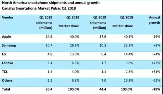 數(shù)據(jù)報(bào)告還顯示,在北美智能手機(jī)市場(chǎng),蘋果和三星優(yōu)勢(shì)十分明顯,兩家公司市占高達(dá)七成。而在前五名中,聯(lián)想、TCL的市占只有個(gè)位數(shù)。除了這五家手機(jī)廠之外,其他智能手機(jī)廠的出貨量暴跌約三分之二,這也表示北美手機(jī)市場(chǎng)已經(jīng)形成高度集中化,其他品牌已經(jīng)很難打進(jìn)。