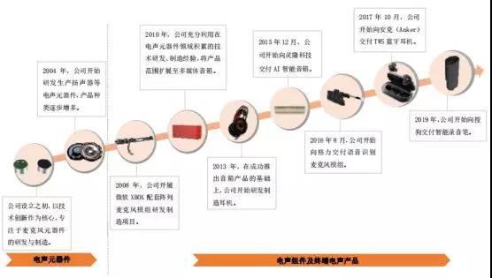 公司起步于微型麥克風(fēng)等專業(yè)電聲元器件的研發(fā)、制造,此后陸續(xù)開發(fā)了揚(yáng)聲器、麥克風(fēng)模組、音箱、耳機(jī)等產(chǎn)品,實(shí)現(xiàn)從元器件向終端電聲產(chǎn)品的成功延伸,目前已發(fā)展成為集研發(fā)設(shè)計(jì)、生產(chǎn)制造為一體的電聲綜合解決方案提供商。