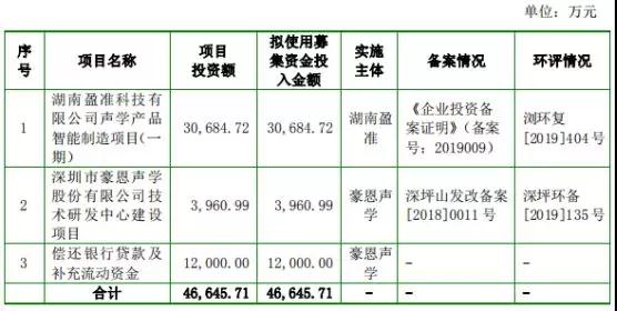 據(jù)IPO招股書顯示,其計(jì)劃募集資金4.66億元,其中湖南盈準(zhǔn)科技有限公司聲學(xué)產(chǎn)品智能制造項(xiàng)目(一期)擬投入資金3.06億元,深圳市豪恩聲學(xué)股份有限公司技術(shù)研發(fā)中心建設(shè)項(xiàng)目擬投資3960萬(wàn),償還銀行貸款及補(bǔ)充流動(dòng)資金投入資金1.2億元!