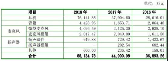 從主營(yíng)業(yè)務(wù)結(jié)構(gòu)來(lái)看,其中耳機(jī)業(yè)務(wù)占據(jù)了絕大部分比例,2016-2018年?duì)I收分別為2.80億元、3.79億元、7.61億元,其次則是麥克風(fēng)業(yè)務(wù),2016-2018年的營(yíng)收分別為4400多萬(wàn)、4100多萬(wàn)、6000多萬(wàn),其三則是音箱業(yè)務(wù),2016年-2018年?duì)I收分別為2064萬(wàn)、1653萬(wàn)、4428萬(wàn)!