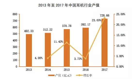 根據(jù)中國(guó)電子音響行業(yè)協(xié)會(huì)的統(tǒng)計(jì),2017年,中國(guó)耳機(jī)行業(yè)產(chǎn)值為728.66億元,相較上年增長(zhǎng)23.05%,產(chǎn)值與增速均創(chuàng)歷史新高。中國(guó)耳機(jī)行業(yè)產(chǎn)值的爆發(fā)源于下游消費(fèi)者旺盛的需求、耳機(jī)產(chǎn)品技術(shù)的更新與升級(jí)、電聲制造企業(yè)智能化和自動(dòng)化提高帶來(lái)的生產(chǎn)供應(yīng)能力提升等。