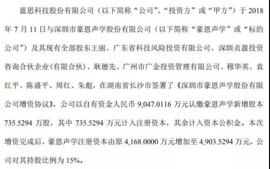 早在2018年7月12日,藍(lán)思科技就曾發(fā)布公告稱,擬以自有資金9047.0116萬(wàn)元認(rèn)繳深圳市豪恩聲學(xué)股份有限公司新增股本735.5294萬(wàn)股,其中735.5294萬(wàn)元計(jì)入注冊(cè)資本,其余計(jì)入資本公積金。本次增資完成后,藍(lán)思科技對(duì)豪恩聲學(xué)持股比例為15%。