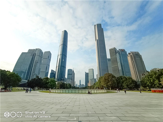 開頭提到,vivo Y3罕見地采用了一顆800萬(wàn)像素120°廣角攝像頭。從樣張的對(duì)比來(lái)看,開啟超廣角模式之后,整體視野有了質(zhì)的提升,不僅能夠觀察到完整的遠(yuǎn)處樓宇,還能夠觀察到更為廣闊天空與廣場(chǎng),廣納天地的視覺一覽無(wú)余。這種模式尤為適合拍攝高大的建筑樓宇以及廣闊的風(fēng)景,拓展了vivo Y3的拍照使用場(chǎng)景。