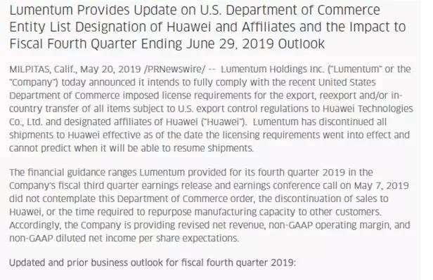 Lumentum表示上一年度來自華為的銷售收入占總銷售收入的比重為11%;截至2019年3月30日的2019會計年度第三季度,來自華為的銷售收入占總銷售收入的比重約為18%;截至5月20日的2019會計年度,來自華為的銷售收入占總銷售收入的比重約為15%。