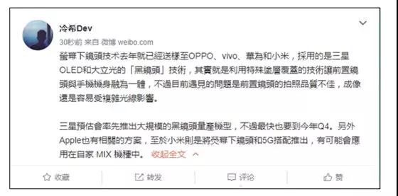 有意思的是,數(shù)小時(shí)后,小米總裁林斌在其微博上公布了小米9屏下攝像頭版,小米公司產(chǎn)品總監(jiān)王騰補(bǔ)充道,這個(gè)視頻本來是想上個(gè)月發(fā)的,擔(dān)心影響K20的宣傳就壓了下,視頻可以看出自拍效果是很好的,但是顯示效果還需要時(shí)間優(yōu)化,請(qǐng)大家先睹為快,我們還需要些時(shí)間繼續(xù)優(yōu)化。
