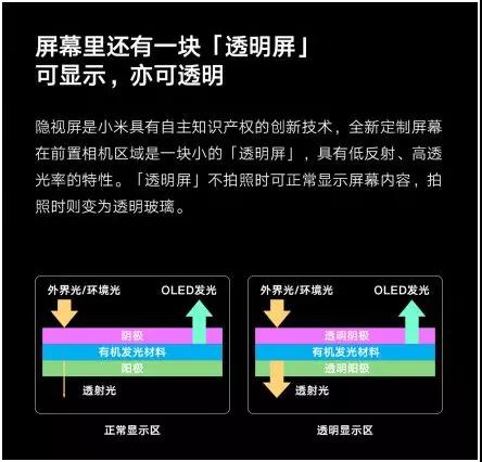 與此同時(shí),小米官方方案里稱,屏幕里還有一塊“透明屏”,可顯示,亦可透明,“隱視屏是小米具有自主知識(shí)產(chǎn)權(quán)的創(chuàng)新技術(shù),全新定制屏幕在前置相機(jī)區(qū)域是一塊小的透明屏,具有低反射、高透光率的特性。”