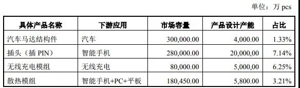 本次募投項目產(chǎn)品下游應(yīng)用包括消費類電子行業(yè)和汽車領(lǐng)域,與公司現(xiàn)有的客戶群體相同。領(lǐng)益智造消費類電子行業(yè)的客戶包括蘋果、華為、OPPO、vivo、小米等;汽車領(lǐng)域客戶群體包括德昌電機、萬寶至馬達、愛龍威電機、MAGNA、DENSO和Brose等。本次募投項目產(chǎn)品設(shè)計產(chǎn)能占預估的市場容量情況如下: