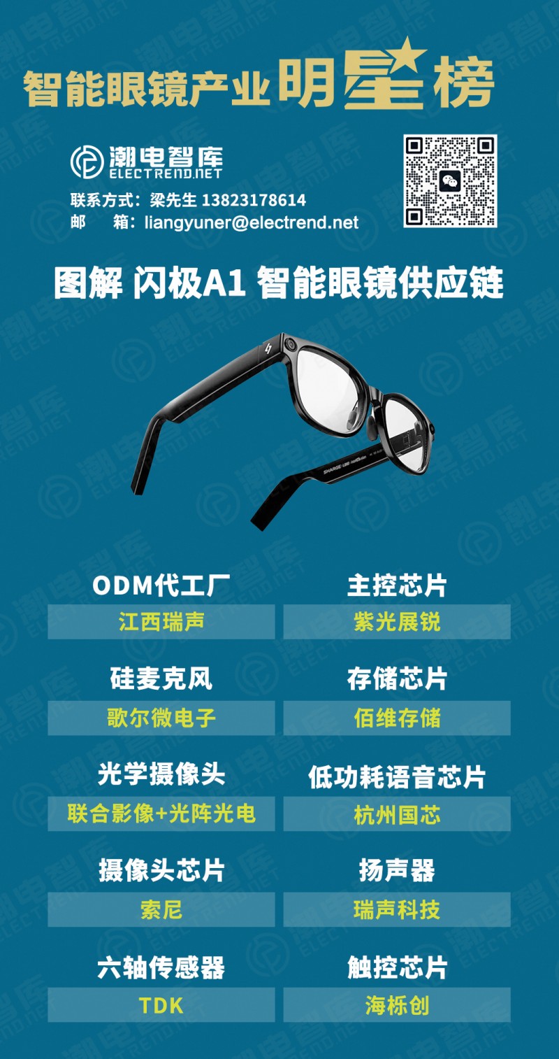 潮電智庫通過AI眼鏡產(chǎn)業(yè)鏈獲悉閃極A1眼鏡ODM代工廠來自江西瑞聲,搭載紫光展銳W517平臺(tái)和杭州國芯的低功耗語音芯片,硅麥克風(fēng)和揚(yáng)聲器分別來自歌爾微電子和瑞聲科技,存儲(chǔ)芯片/觸摸芯片/六軸傳感器供應(yīng)商分別來自佰維存儲(chǔ),海櫟創(chuàng),TDK,光學(xué)攝像頭供應(yīng)商為光陣光電+聯(lián)合影像,CMOS則是采用的索尼半導(dǎo)體。