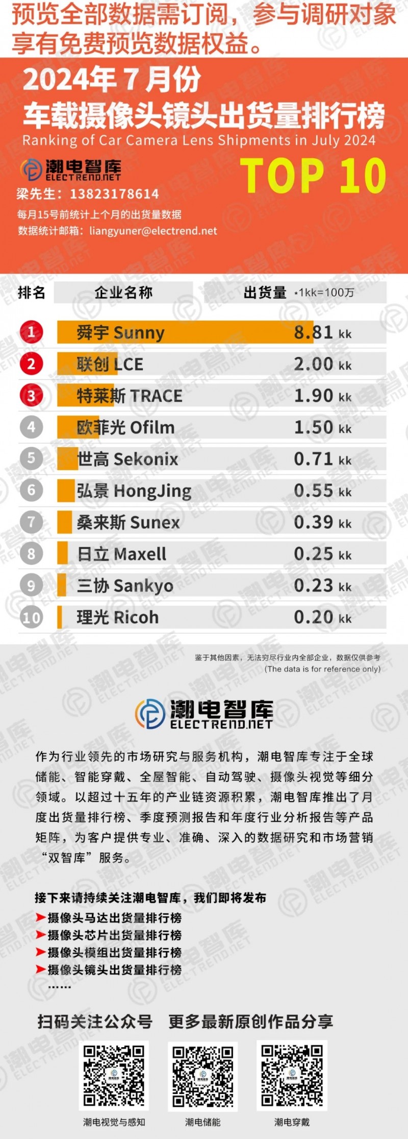 2024年7月車載鏡頭出貨量排行榜TOP10