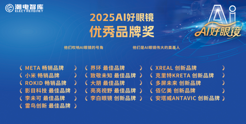 meta(暢銷品牌)、小米(暢銷品牌)、Rokid(暢銷品牌)、影目科技(最佳品牌)、李未可(最佳品牌)、雷鳥創(chuàng)新(最佳品牌)、界環(huán)(最佳品牌)、致敬未知(最佳品牌)、大朋(最佳品牌)、亮亮視野(最佳品牌)、李白眼鏡(創(chuàng)新品牌)、XREAL(創(chuàng)新品牌)、克里特KRETA(創(chuàng)新品牌)、多屏未來(創(chuàng)新品牌)、佰億美(創(chuàng)新品牌)、安塔威(創(chuàng)新品牌)