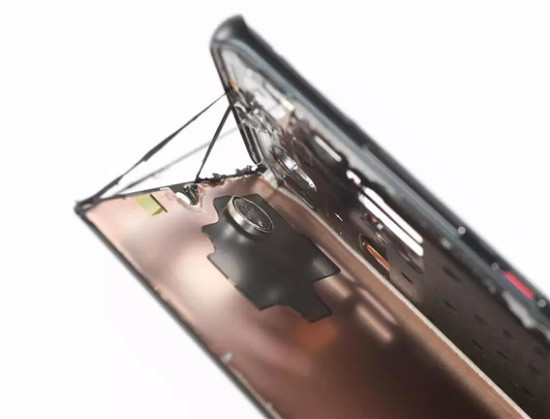 我們注意到鏡框和后玻璃之間有一個非常緊密的間隙,肉眼幾乎看不到。通過封底膠。其后蓋是由玻璃制成的,以提高設(shè)備的性能,使無線充電成為可能。