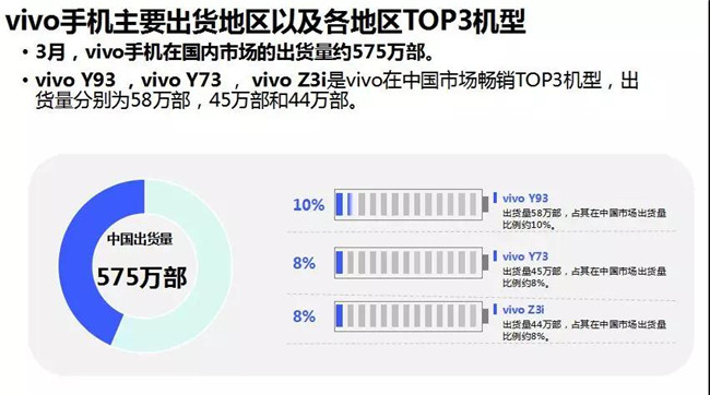 今年3月,vivo手機在國內(nèi)市場的出貨量約575萬部,其中,vivo Y93、vivo Y73、vivo Z3i是vivo在中國市場暢銷TOP3機型,出貨量分別為58萬部、45萬部和44萬部。