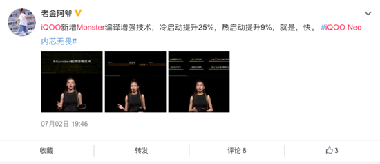 軟件部分,iQOO Neo采用了Monster編譯增強(qiáng)技術(shù)。這項(xiàng)技術(shù)可以對(duì)系統(tǒng)底層基礎(chǔ)進(jìn)行全面優(yōu)化,在應(yīng)用運(yùn)行時(shí),提前進(jìn)行預(yù)編譯,大幅改善底層編譯效率,提升手機(jī)性能和APP響應(yīng)速度,為iQOO Neo的驍龍845強(qiáng)勁心臟再提速。對(duì)于這項(xiàng)技術(shù)的加入,網(wǎng)友們表示:“iQOO新增Monster編譯增強(qiáng)技術(shù),冷啟動(dòng)提升25%,熱啟動(dòng)提升9%,就是,快。”
