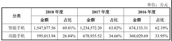 報(bào)告期內(nèi),公司主要從事以手機(jī)為核心的智能終端的生產(chǎn)、研發(fā)、銷售及品牌運(yùn)營(yíng)。手機(jī)是公司的主要產(chǎn)品,包括功能機(jī)和智能機(jī)。2018年,公司全品類手機(jī)出貨量位列全球第四,非洲市場(chǎng)占有率位列第一。2016至2018年,公司智能手機(jī)銷量由1661萬(wàn)臺(tái)增長(zhǎng)至3406萬(wàn)臺(tái),智能手機(jī)的銷售金額由67.41億元增長(zhǎng)至154.78億元,功能機(jī)的銷量由5896萬(wàn)臺(tái)增長(zhǎng)至9022萬(wàn)臺(tái),銷售金額由36.80億元增長(zhǎng)至59.50億元。智能機(jī)銷售量及銷售金額、占比不斷上升。