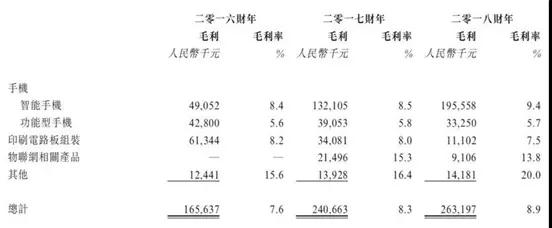 早在2019年4月,據(jù)手機(jī)報(bào)在線查詢得知,出貨量在旭日大數(shù)據(jù)排行中位列第十左右的禾苗,日前也在港股啟動(dòng)了IPO,其2018年手機(jī)出貨量2000萬部出頭,其中智能機(jī)只有700多萬部,毛利率為5.7%,而功能機(jī)近1300萬部,毛利率為9.4%,綜合毛利率為8.9%。