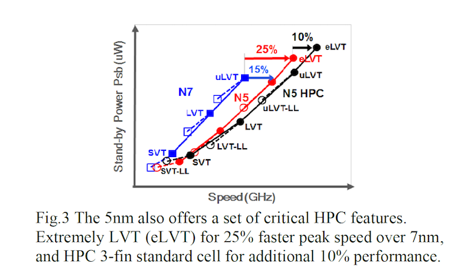 在IEDM上,TSMC還描述了七種不同的晶體管供客戶挑選,包括高端的eVT和低端的SVT-LL,uLVT、LVT和SVT(這三種都是低泄漏/LL的衍生版本),以及從uLVT大幅跳躍到的eLVT。