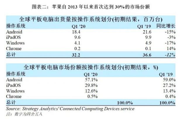 Strategy Analytics資深研究分析師Chirag Upadhyay補(bǔ)充說(shuō):“總體而言,由于全球COVID-19疫情阻礙了經(jīng)濟(jì)活動(dòng),因此2020年第二季度消費(fèi)者將承受巨大壓力。然而,有證據(jù)表明,隔離期間,人們?cè)诩肄k公以及學(xué)習(xí),對(duì)平板電腦的需求強(qiáng)烈,這將使諸如蘋果和聯(lián)想之類的一些廠商受益。”