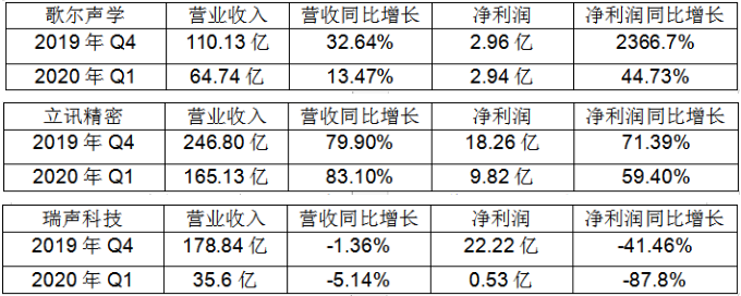 根據(jù)瑞聲科技2020年第一季度財報,營業(yè)收入178.84億元,同比下降1.36%,凈利潤22.22億元,同比下降87.8%。瑞聲科技是全球微型聲學行業(yè)的引領者之一,是三星、蘋果、華為等知名手機品牌的老牌供貨商,在TWS耳機領域具有無可比擬的競爭優(yōu)勢。