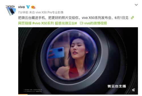 2020年5月29日,vivo官方微博為即將發(fā)布的X50系列做最后準(zhǔn)備:“把微云臺(tái)藏進(jìn)手機(jī),把更好的照片交給你。vivo X50系列發(fā)布會(huì),6月1日見”。作為vivo X系列的最新旗艦,X50系列主打時(shí)尚外觀和全焦段智慧影像概念,同時(shí)vivo X50系列采用突破性雙色云階設(shè)計(jì),將人文與科技巧妙融合,將微云臺(tái)“塞入”手機(jī)當(dāng)中,并將“雅致”二字作為核心設(shè)計(jì)理念貫穿X50系列當(dāng)中。
