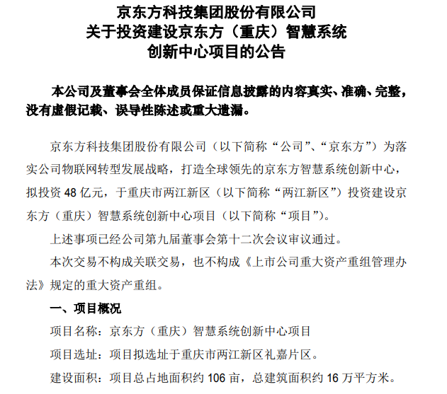 京東方公告稱,為落實(shí)物聯(lián)網(wǎng)轉(zhuǎn)型戰(zhàn)略,擬投資48億元在重慶兩江新區(qū)投資建設(shè)京東方(重慶)智慧系統(tǒng)創(chuàng)新中心項(xiàng)目(以下簡(jiǎn)稱“重慶項(xiàng)目”),擬投資60億元在成都高新西區(qū)投資建設(shè)京東方(成都)智慧系統(tǒng)創(chuàng)新中心項(xiàng)目(以下簡(jiǎn)稱“成都項(xiàng)目”)。