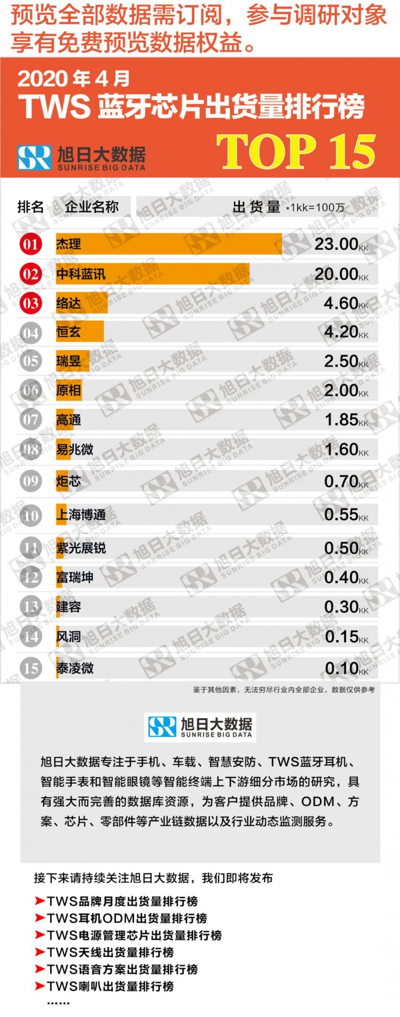 藍牙芯片前五強總體出貨量為54.3kk,環(huán)比3月下降24%。