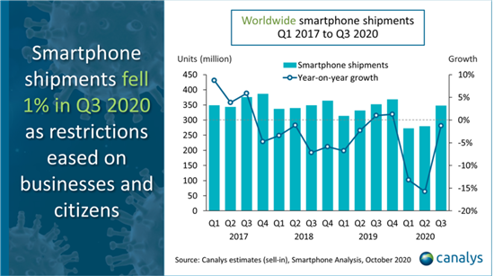 10月30日,國(guó)際市場(chǎng)研究機(jī)構(gòu)Canalys發(fā)布全球手機(jī)市場(chǎng)Q3季度跟蹤報(bào)告,數(shù)據(jù)顯示,2020年Q3,全球智能手機(jī)出貨量同比下降1%,但環(huán)比增長(zhǎng)22%。頭部廠商中變化最大的是,小米出貨量位居全球第三。這是繼2014年之后,小米第二次進(jìn)入全球前三,同比增長(zhǎng)45%,是前四名中唯一逆勢(shì)大漲的手機(jī)廠商。