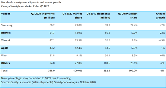 Canalys:小米Q3逆勢(shì)大漲,全球智能手機(jī)市場(chǎng)份額進(jìn)入前三