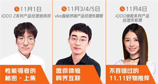 面對(duì)大牌嘉賓和品牌大佬的狙擊,vivo iQOO的產(chǎn)品經(jīng)理們直播起來(lái)也毫不示弱:11月1日,iQOO Z系列產(chǎn)品經(jīng)理施雨辰將為用戶解讀性能強(qiáng)者的秘密;11月3日、4日、5日連續(xù)三天,vivo智能終端產(chǎn)品經(jīng)理朱慧敏邀你體驗(yàn)跨界互聯(lián);11月4日,iQOO旗艦系列產(chǎn)品經(jīng)理宋紫薇將為大家推薦不容錯(cuò)過(guò)的雙十一好物;11月5日,vivo X系列影像產(chǎn)品經(jīng)理張依格會(huì)帶領(lǐng)大家領(lǐng)略手機(jī)影像的藝術(shù);11月7日,iQOO Z系列產(chǎn)品經(jīng)理邢程將為大家繼續(xù)解密性能強(qiáng)者的秘密。