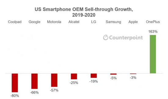 Counterpoint:一加成2020年美國(guó)唯一逆勢(shì)增長(zhǎng)手機(jī)品牌 年增幅達(dá)163%