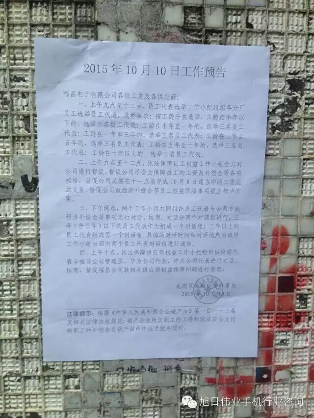 10月10日龍崗街道辦貼出公告,公告顯示讓員工按工齡選出員工代表參與督促公司保障員工的工資及補償金等權益,并督促公司必須在上午十一點前完成工資發(fā)放義務;另外,公告也顯示,上午十點,供應商代表與福昌管理層、華為公司代表、中興公司代表進行對話;下午兩點,員工代表和供應商代表與公司方對話。