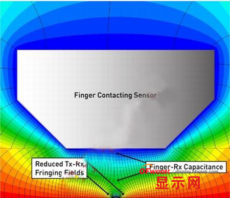 當(dāng)手指觸摸蓋板時(shí),Tx與手指之間形成磁力線,這些磁力線取代了大量的Tx-Rx邊緣磁場(chǎng),如圖3所示。通過這種方式,手指觸摸減少了Tx-Rx互電容。電荷測(cè)量電路識(shí)別出變化的電容(△C),從而檢測(cè)到Tx-Rx結(jié)點(diǎn)上方的手指。通過對(duì)Tx-Rx矩陣的所有交叉點(diǎn)進(jìn)行△C測(cè)量,便可得到整個(gè)面板的觸摸分布圖。