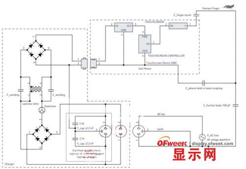 在充電器前端,交流電源電壓整流生成充電器高電壓軌。這樣,充電器的開關(guān)電壓分量疊加在一個(gè)電源電壓一半的正弦波上。與開關(guān)干擾相似,此電源電壓也是通過開關(guān)隔離變壓器形成耦合。在50Hz或60Hz時(shí),該分量的頻率遠(yuǎn)低于開關(guān)頻率,因此,其有效的耦合阻抗相應(yīng)更高。電源電壓干擾的嚴(yán)重程度取決于對(duì)地并聯(lián)阻抗的特性,同時(shí)還取決于觸摸屏控制器對(duì)低頻的靈敏度。